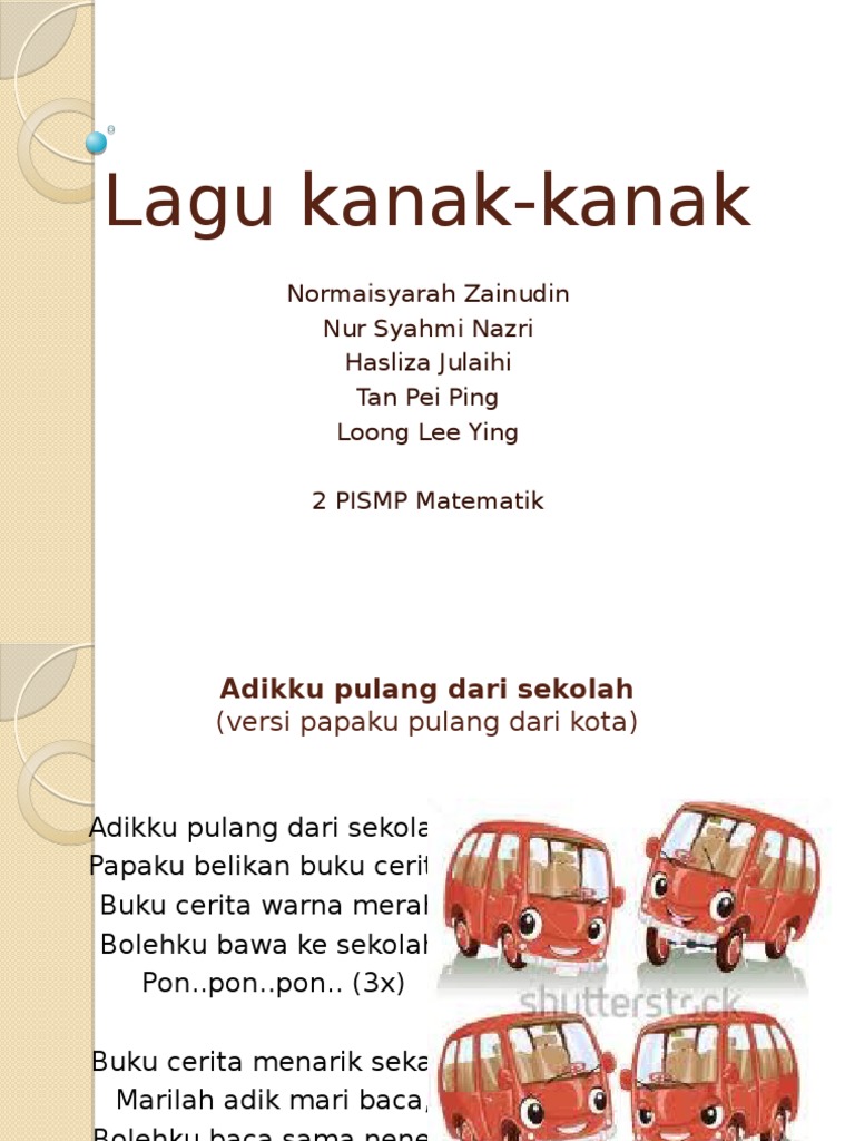 17 lirik lagu kanak-kanak. Norly Jamil 2015 pula menyatakan bahawa kanak-kanak belajar matematik melalui pengalaman mereka sama ada di dalam atau di luar bilik darjah. 7 Tema lagu mestilah berkaitan pengalaman dan persekitaran harian kanak-kanak 1.